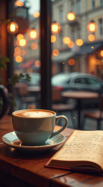 Фотографичная обложка книги. Тёплая, уютная атмосфера осеннего кафе. Крупным планом — чашка кофе с корицей на деревянном столе, на заднем плане размытое окно с каплями дождя и мягкий свет уличных фонарей. На столе рядом с чашкой — раскрытый блокнот с рукописными заметками. Надпись крупно: «Кликни себя сам 2.0». Подзаголовок мельче: «Дневник человека, который перестал кликать и начал быть». Стиль: тёплый, уютный, вдохновляющий. Цветовая гамма: кофейные оттенки, золотистый, мягкий зелёный. Без людей.