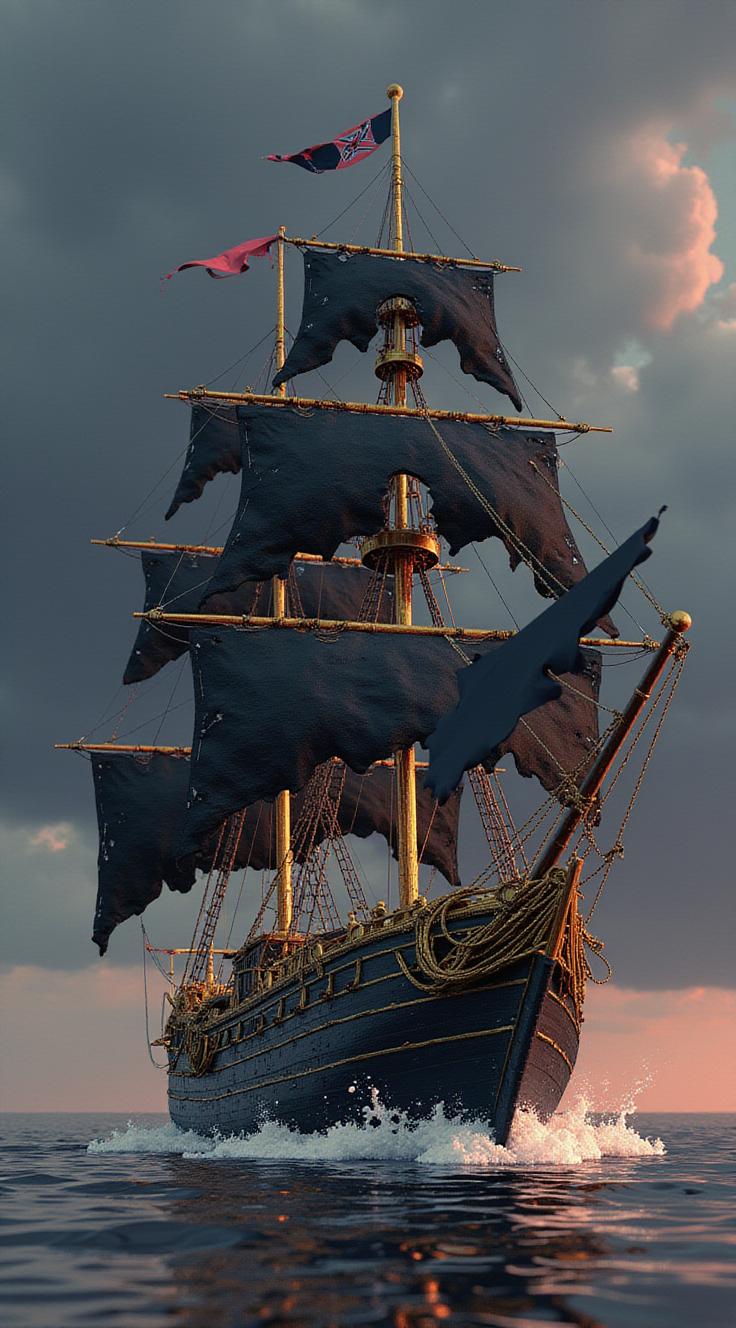 Создай арт-изображение пиратского корабля в готическом стиле. Корабль полностью чёрный, с рваными парусами и потрёпанным корпусом. Вокруг корабля — всплески золотой краски, создающие ощущение движения и энергии. Фон — тёмно-серый, с лёгкими облаками. Используй контрастные цвета и выразительные тени. Формат — вертикальный