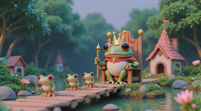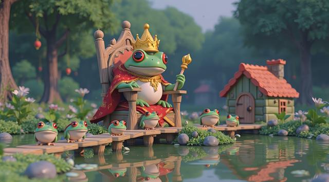 Племя жаб и лягушек на болоте. По середине на троне сидит огромная жаба в короне и мантии, в руках скипитар. К трону ведут маленькие деревянные мостики. По ним идут лягушки маленькие. У лягушек в руках самые разные предметы, которые они несут королю. На фоне также видно пару маленьких домиков, где живут лягушки. Король жаб выглядит мудро. Стиль реализм, фотография, панорамный вид из далека.