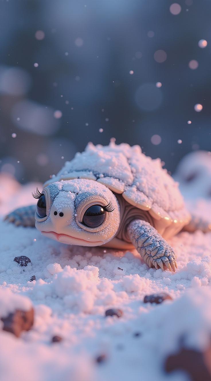 Очень реальная фотография, снята на fujifilm X-T5. К4. Снято в студии. изображен светлый сияющий светящийся маленький умилительный пушистый детеныш черепахи в припорошенном снежке, в бриллиантовой, хрустальной и жемчужной пыли и с большими умилительными глазами и ресницами. Детёныш черепахи лежит на траве на фоне белых еловых пушистых веток и раздвигает ножки в разные стороны. Новогодняя тема. Супер фантазия. Элита, богема, манерность, красота, аристократизм. Гиперреалистичность, супердетализация, стиль vogue, intricate