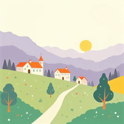 сделай пейзаж города минимализм в стилистике всех 4 времен года с мягкими оттенками по триадному цветосочетанию:, , Весна, Основные цвета: мягкий светло-зелёный, нежно-фиолетовый, и теплый жёлтый., Описание: зелень холмов и листьев в нежном салатовом оттенке, дома - оттенки фиолетового (лаванда, сирень), деревья и детали - мягкие желтые тона.