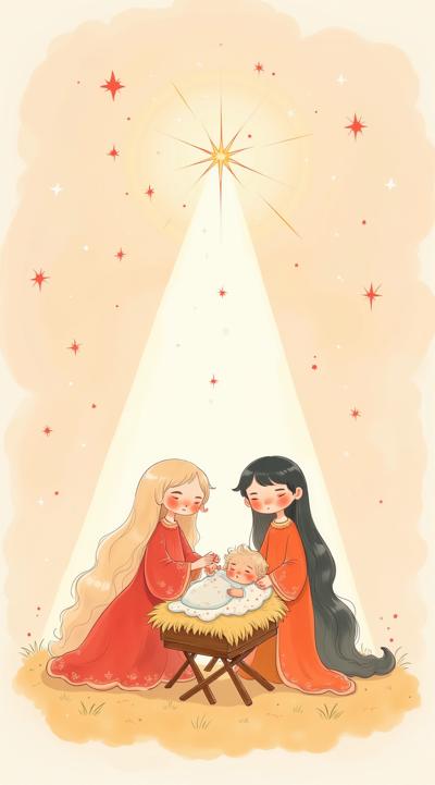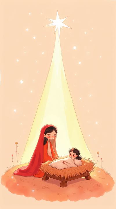 Светлый фон с красными рождественскими тонами, в центре младенец Христос в яслях, над ним звезда Вифлеемская и от неё свет к яслям. В стиле милом акварельным, с мягкими углами. По место Писанию: «ибо ныне родился вам в городе Давидовом Спаситель, Который есть Христос Господь;» Отец будет с более мягкими чертами и понятными