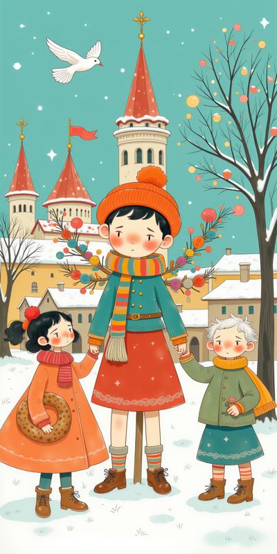 A festive fair scene in the style of Boris Kustodiev: children and adults joyfully celebrate amidst a snowy landscape with ancient Russian architecture in the background. In the center, a colorful scarecrow adorned with bright ribbons symbolizes the end of winter. Children hold bagels and fluttering ribbons, their poses dynamic and full of movement. Vibrant, saturated colors; soft, warm shadows; clear, expressive lines. The sky is bright and cloudless, enhancing the festive atmosphere. Rich details: patterned scarves, wooden stalls, snow-dusted roofs. Watercolor, 9:16.