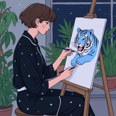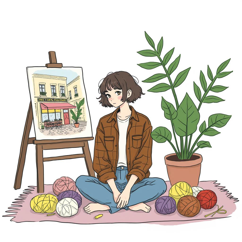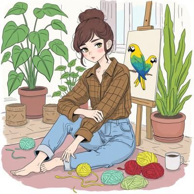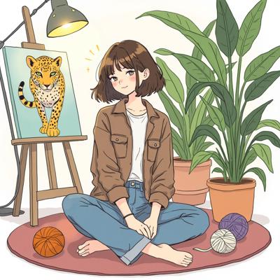 Счастливая Девушка с коричневыми волосами, стрижка каре , без челки , Смотрит в кадр. Одета в коричневую клетчатую рубашку и джинсы. Сидит на полу на ковре. Рядом лежат клубки пряжи. Сзади стоит мольберт. На нем картина с леопардом. Сзади много комнатных растений. Светится бумажная напольная лампа , , , Сверху надпись tehtura