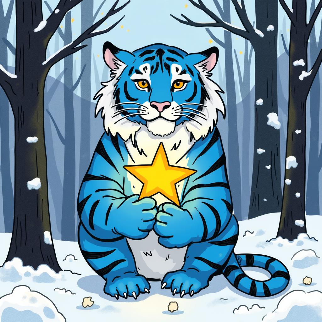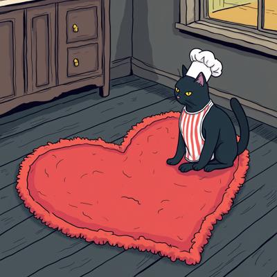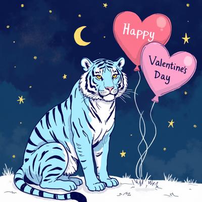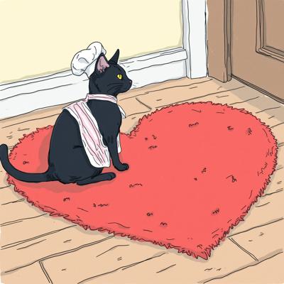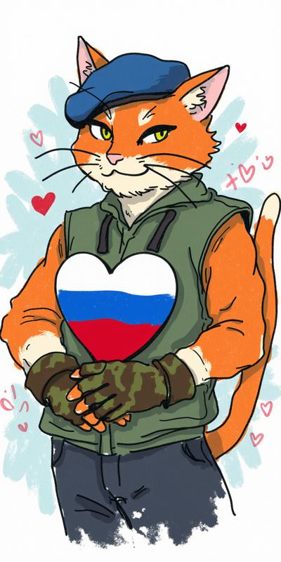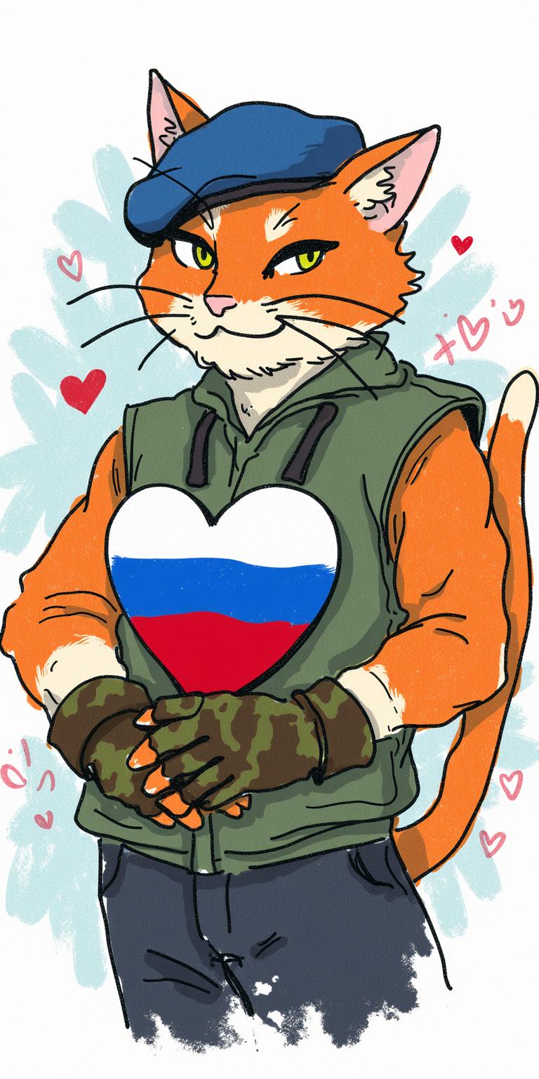 антропоморфный кот с выраженной мускулатурой. Кот одет в тельняшку и голубой берет, на лапах — камуфляжные перчатки. Он держит перед собой сердце, раскрашенное в цвета российского триколора (белый, синий, красный), символизирующее любовь к Родине. Фон открытки — динамичный, с абстрактными брызгами краски (преобладают красный, белый и синий цвета),