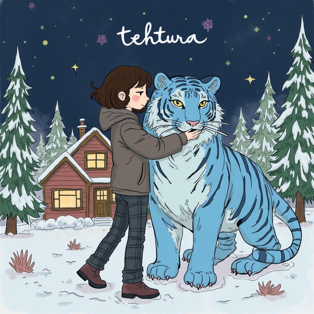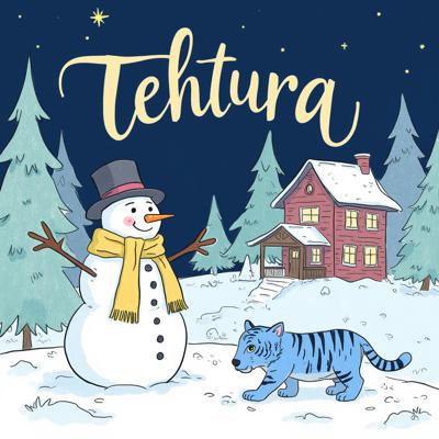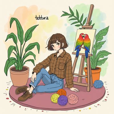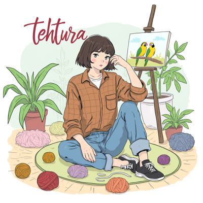 Сверху надпись tehtura , Девушка с коричневыми волосами, короткой стрижкой , Смотрит в кадр. Одета в коричневую клетчатую рубашку и джинсы. Сидит на полу на ковре. Рядом лежат много клубки пряжи. Сзади стоит мольберт. На нем картина с попугаями. Сзади много комнатных растений. Светится бумажная напольная лампа , Сверху надпись название группы tehtura