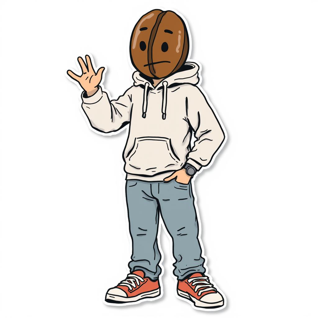 Стикеры. Арик - кофейное зернышко арабики. Это яркий, дружелюбный, веселый, но в тоже время уставший персонаж – талисман кофейни «Время кофе». Он одет в удобную одежду – худи, джинсы на высокой посадке и кроссовки. На правой руке у него есть часы. Арик является обычным студентом в вузе, который ходит на пары, но не особо участвует в различных мероприятиях. ,