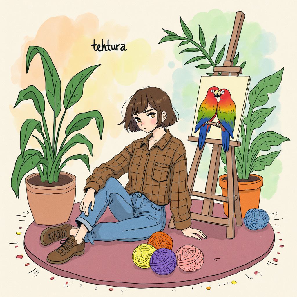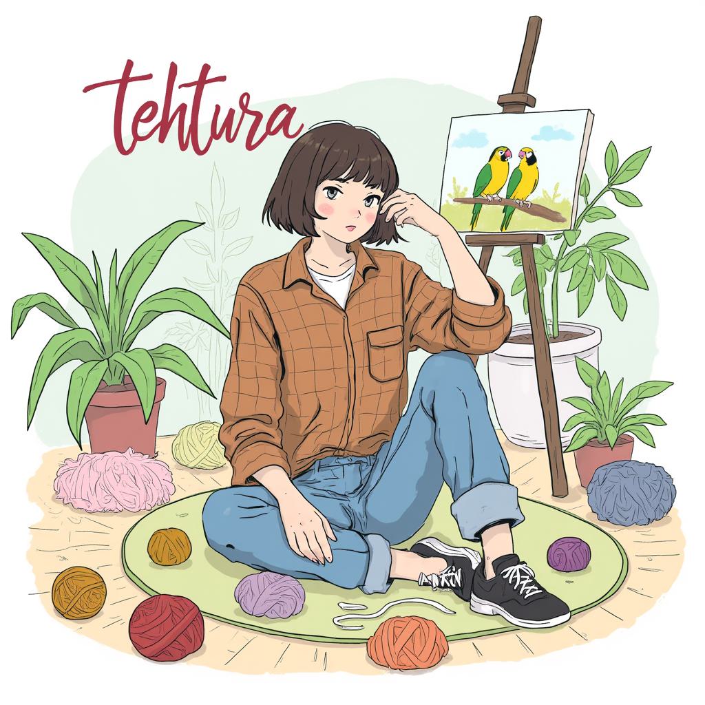 Сверху надпись tehtura , Девушка с коричневыми волосами, короткой стрижкой БЕЗ ЧЕЛКИ , Смотрит в кадр. Одета в коричневую клетчатую рубашку и джинсы. Сидит на полу на ковре. Рядом лежит много клубков пряжи. Сзади стоит мольберт. На нем картина с попугаями. Сзади много комнатных растений. Напольная лампа , Сверху надпись название группы tehtura
