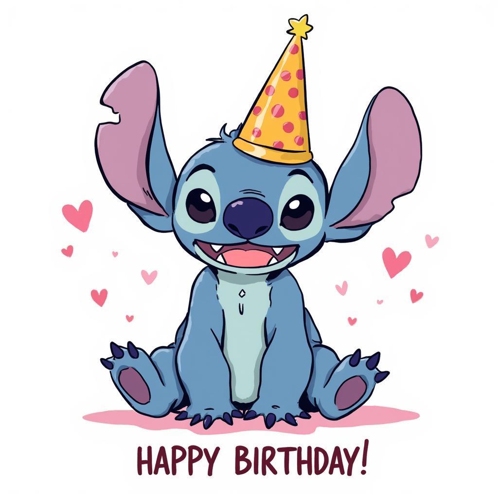 A cute and playful birthday card featuring Stitch, digital painting, hand-drawn style, painted with graphics tablet, expressive brush strokes, painterly shading, soft and textured brushwork, detailed character design with vibrant colors, whimsical and charming, warm and cheerful lighting, subtle canvas texture, slightly rough edges, dynamic composition with Stitch in the center, surrounded by birthday elements like balloons, confetti, and cake, soft shadows and highlights, storybook illustration style, professional digital artist feel, hand-painted look, joyful and festive atmosphere, perfect for a birthday greeting card, ,