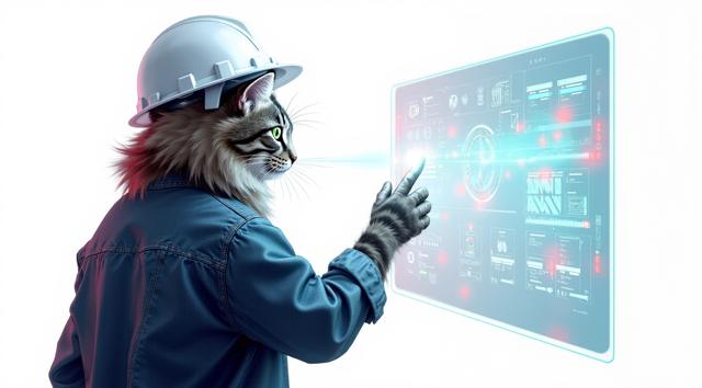 White background. An anthropomorphic, fluffy Siberian cat with gray-brown tabby fur, wearing a denim shirt with rolled-up sleeves and a white hard hat. This cat controls the holographic interface of a SCADA system on a transparent screen. White background with neon accents in a cyberpunk style. Highly detailed. Very bright and positive image.