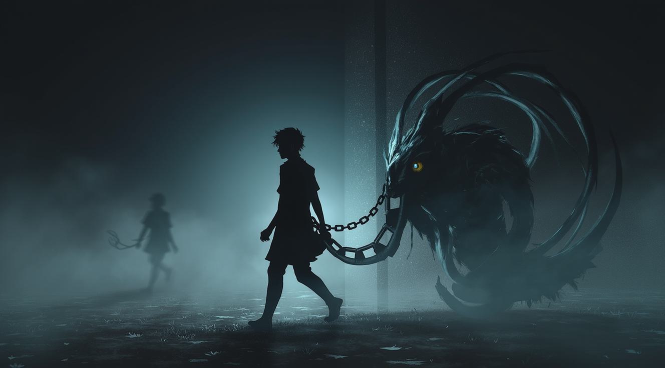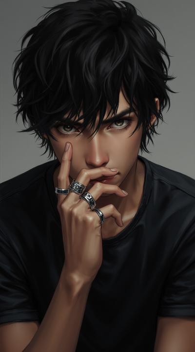 A 22-year-old man with sharp, intense features, dark tousled hair, and no facial hair. His expression is a mix of obsession and vulnerability, dark eyes staring directly at the viewer. He has a lean but muscular build, visible through a worn black t-shirt. Several silver rings on his fingers, one slightly tarnished. A fresh scar runs through his left eyebrow, another on his neck, partially hidden by the collar. Post-apocalyptic setting, dim industrial background with rusty pipes and faint light. His posture is protective yet threatening, one hand slightly raised as if to touch or claim. Atmosphere raw, emotional, intense. Cinematic lighting, high contrast.