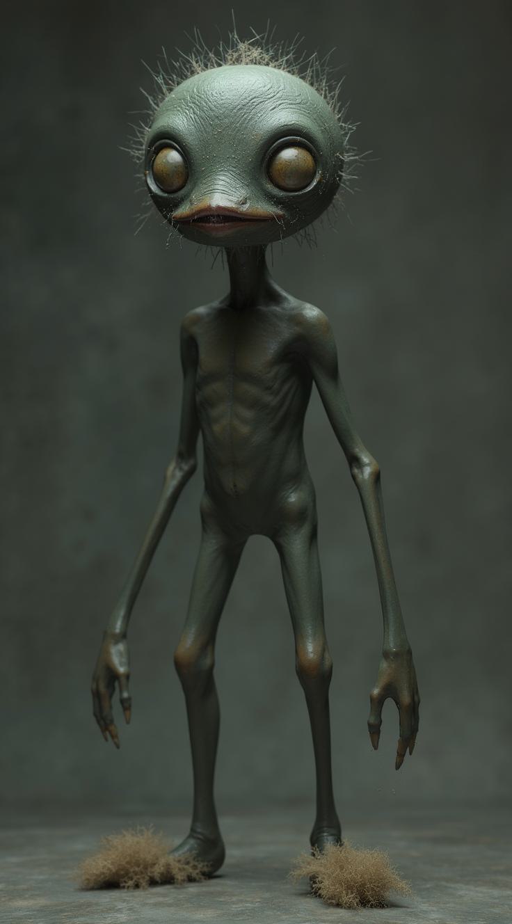 Темная кожа.обута в тряпичные тапочки. Похожа на человека долговязую фигуру с двумя парами локтей на длинных и тонких верхних конечностях. Ноги у существа обычные одноколенные, чрезвычайно длинные и тонкие. у создания круглое лицо, короткие курчавые волосы и длинный, печальный нос. рот с двумя рядами верхних и двумя рядами нижних зубов. глаза Огромные, с ярко-фиолетовой радужкой и длинными ресницами. В серой тунике до колен и без рукавов, на поясе скрученной толстой веревкой