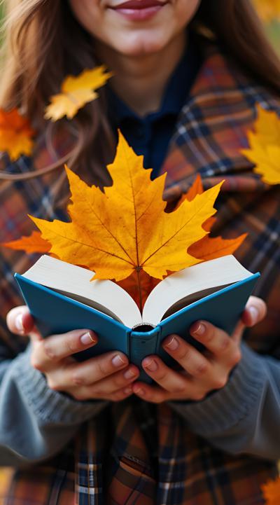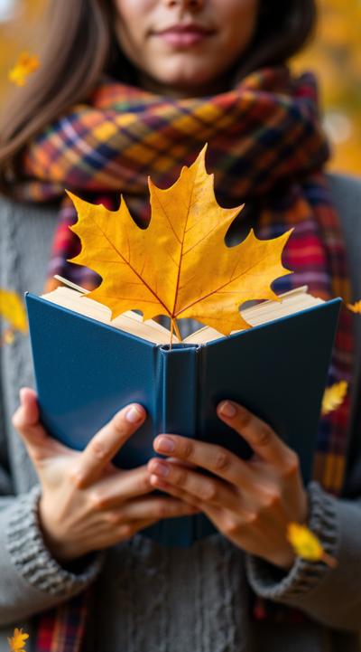 Крупный план. Женские руки прижимают к себе книгу в синем переплете, из книги торчат осенние желтые и оранжевые листья. Девушка одета в свитер и на нее накинут плед. Вокруг парят осенние листья. Атмосфера осени и октября. Книга в синем переплете, вокруг осенние желтые и оранжевые листья. Уют, плед, осень