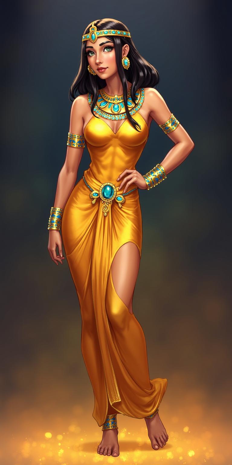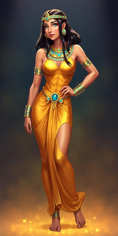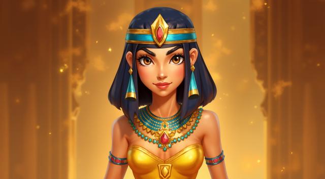 A full-body 2D cartoon Cleopatra character in ancient Egyptian royal attire, designed as a slot game high-pay symbol. Cleopatra is standing upright, facing forward, with a graceful and majestic pose. She wears a golden dress with turquoise and blue accents, decorated with jewelry, wide beaded collar, golden bracelets, and a traditional cobra crown (uraeus). Her facial expression is gentle and kind, with a soft smile. The character is framed by a decorative golden border with turquoise accents, making her stand out as a high-value symbol. Art style: soft, colorful, hand-drawn 2D, smooth shading, shiny highlights, no 3D realism. Transparent background.