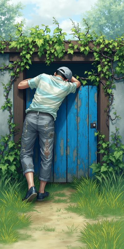 Стиль акварель. Деревянная низкая, по пояс калитка заросшая вьюном и травой, окрашена голубой краской, которая выцвела и облупилась. Опершись на калитку спит мужчина, в серой кепке, одет в серые протёртые, в заплатках штаны, подвязанные верёвкой вместо ремня, светлая в полоску рубаха выцветшая, стёганая жилетка Перед калиткой полевые цветы. За калиткой старый заброшенный сад, в котором очень высокая трава, на деревьях много яблок, ветви гнутся от урожая. Гнилые яблоки лежат внизу в траве.