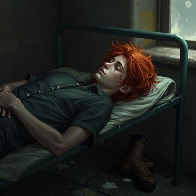 25 years old red-haired male medic with kind tired face, freckles, thin build, lying on narrow military cot in messy post-apocalyptic room. Wearing dark wrinkled shirt with rolled sleeves, loose pants, worn boots on floor. Pretending to sleep — eyes closed but eyelids slightly tense, breathing too steady. Hand loosely holds girl's hand nearby. Background: wooden bookshelf with old books, dried herbs hanging from ceiling, medical supplies on table, dim candle light, warm dusty atmosphere. Morning light barely visible through small window. Cozy intimate mood, quiet tension.
