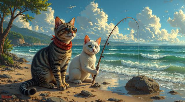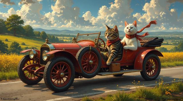 СРЕДНЕВЕКОВАЯ КЛАССИЧЕСКАЯ ДЕТАЛИЗИРОВАННАЯ ЖИВОПИСЬ. СЕРЫЙ ПОЛОСАТЫЙ КОТ И БЕЛАЯ КОШКА СМЕЮТСЯ, СИДЯТ РЯДОМ И ЕДУТ НА ШИРОКОМ РЕТРО АВТОМОБИЛЕ С РЕЗИНОВИМИ ШИНАМИ, ПОЛНОСТЬЮ ПОКАЗАННОМ НА КАРТИНЕ, ВИКТОРИАНСКОЙ ЭПОХИ ПО ДОРОГЕ. У БЕЛОЙ КОШКИ НА ШЕЕ ПЕСТРЫЙ КРАСНЫЙ ШАРФ, ИЗВИВАЮЩИЙСЯ ОТ ВЕТРА. КОТ В СОЛНЕЧНЫХ ОЧКАХ СИДИТ ЗА РУЛЕМ
