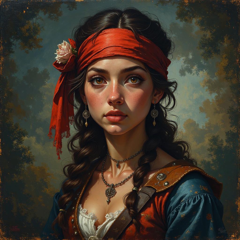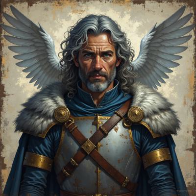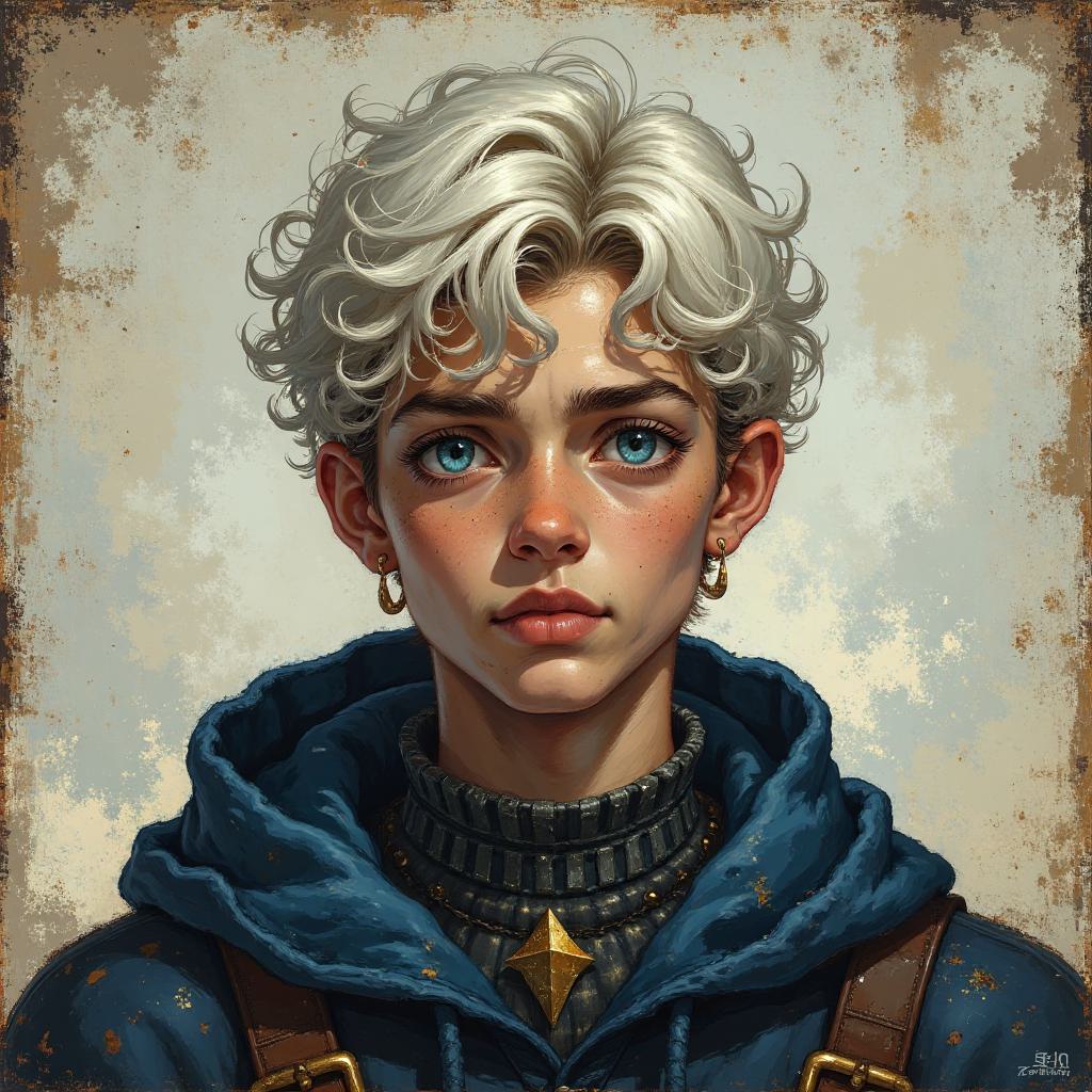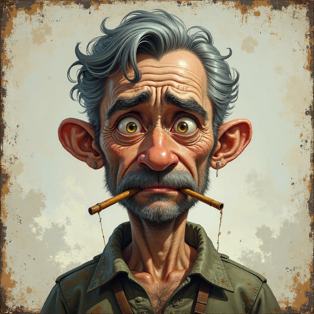 Персонаж в анфас по плечи на однотонном потертом фоне. Высокий, жилистый мужчина, с кожей серого цвета, глаза желтоватые, зрачки узкие, взгляд недовольный, хмурый. Волосы седые немного растрепанные, зачесаны назад, усы седые аккуратно подкручены. В зубах держит соломинку. Одет в простую грязную крестьянскую рубашку