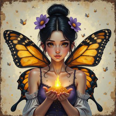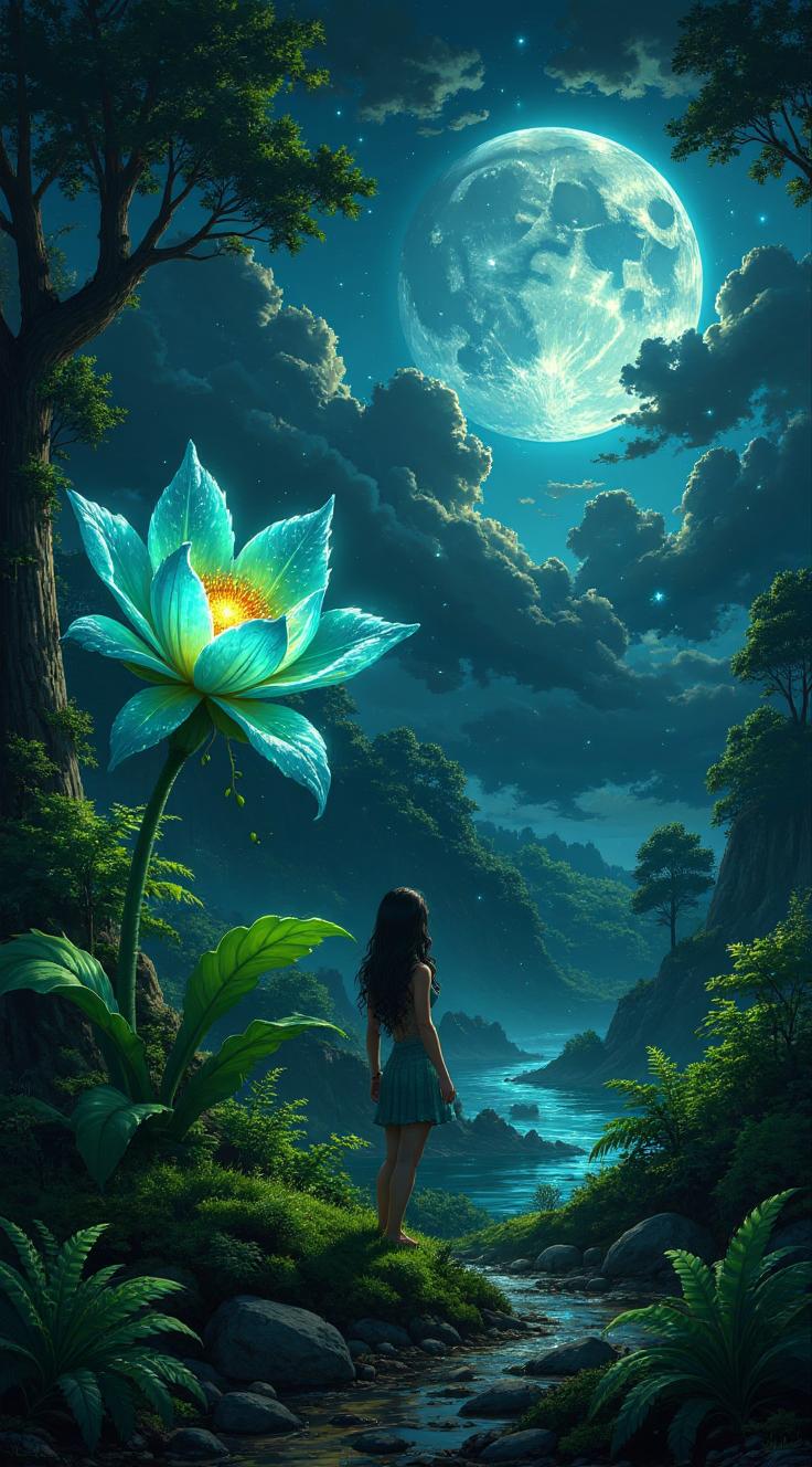 Ночной лес, залитый лунным светом. Среди папоротников и светящихся мхов распустился магический цветок — его лепестки переливаются флуоресцентным зелёным, голубым и серебром. Рядом с ним парит юная ночная фея curvy PAWG с огромной макромастией, тонкой талией и широкими бёдрами. Её крылья полупрозрачны, переливаются как перламутр, длинные светящиеся волосы струятся по воздуху. Она нежно касается цветка рукой, вокруг искрятся мириады спор и светлячков. Туман подсвечен снизу, создавая волшебное сияние. Full frame DSLR, HDR, macro, high detail, night shot, long exposure, cinematic light.