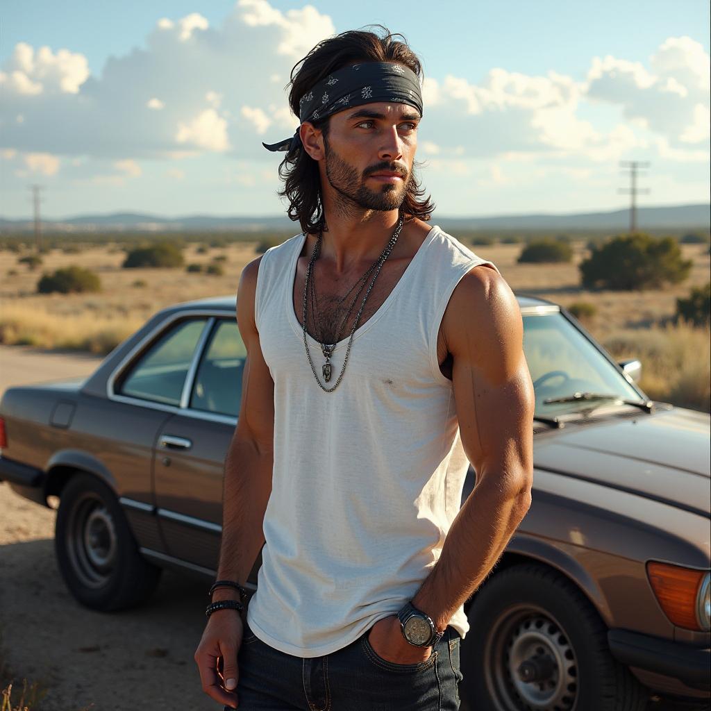 Парень стоит возле машины с длинными тёмными волосами, собранными сзади и частично прикрытыми тёмной повязкой или банданой. Его выражение лица спокойное, с лёгкой полуулыбкой, взгляд направлен немного в сторону. В белой майке без рукавов, подчёркивающая его расслабленный стиль; тёмные облегающие джинсы; коричневые ботинки; на шее висит кулон на цепочке, напоминающий жетон; поза расслабленная: одна рука в кармане, другая держит шарф, пальцы слегка согнуты.
