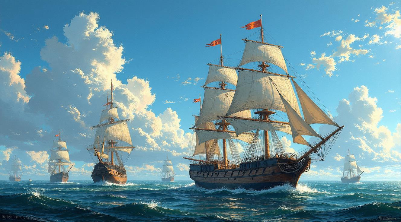 НАРИСУЙ 2 Парусных фрегата XVIII–XIX веков , это быстроходный трехмачтовый военный корабль с полным парусным вооружением. Характеристики включали водоизмещение 1000–2000 тонн, длину 40–50 м, ширину 11–13 м и вооружение из 24–50 орудий 24-фунтовые пушки, с экипажем 300–450 человек. НА МОРЕ СРЕДНЕЙ ВОЛНИСТОСТИ ПАЛИТРА МОРСКОЙ ВОДЫ БЕЛЫЕ ОХРОВЫЕ УМБРОВЫЕ КОРИЧНЕВЫЕ СЕРЫЕ ЦВЕТА,