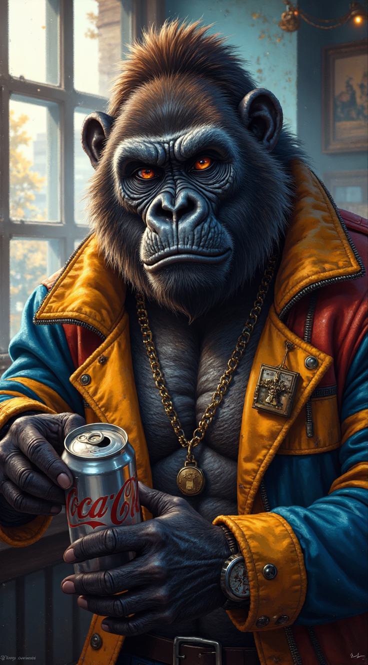 Фотореалистичный портрет гориллы,грозный вид, в стильной разноцветной желете, держит в руках металлическую банку колы. смотрит в камеру, яркий фон. Мягкий контровой свет, реалистичные отражения на банке, детализированная текстура меха и кожи куртки, выражение лица уверенное и харизматичное, полупрофиль по пояс, малая глубина резкости (размытый фон), насыщенные, естественные цвета, высокая детализация, 4k, 85mm, f/1.8