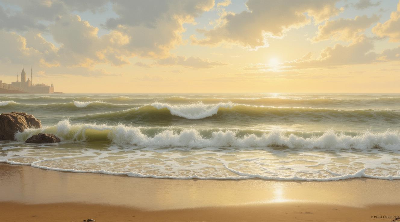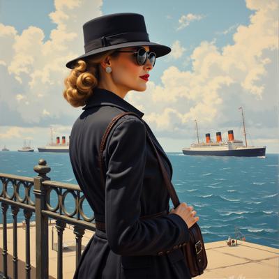 НАРИСУЙ КАРТИНУ В СТИЛЕ Jack Vettriano ТЕХНИКОЙ ШИРОКИМИ МАЗКАМИ С ТЕКСТУРНЫМ НАСЛОЕНИЕМ. ЖЕНЩИНА АРИСТОКРАТИЧНОГО ВИДА , ОДЕТАЯ в пальто и шляпу ПО МОДЕ 1950 ГОДА, ПОКАЗАННАЯ ДО ПОЯСА В ТОЛСТЫХ СОЛНЕЧНЫХ ОЧКАХ и сумочкой через плече В ПРОФИЛЬ НА ФОНЕ ограды и гигантских атлантических пароходов НА ПРИСТАНИ В ВЛАСТНОЙ ПОЗЕ