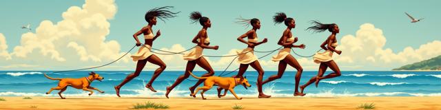 НАРИСУЙ КАРТИНУ В СТИЛЕ Jack Vettriano .Сложные вытянутые геометрические формы, модерн, фигуры в стиле КАРТИН Jeremy Mann В СОЛНЕЧНЫЙ ДЕНЬ ТРИ АФРИКАНСКИЕ ЖЕНЩИНЫ В ПРОФИЛЬ В НАБЕДРЕННЫХ КОРОТКИХ МИНИ ПОВЯЗКАХ С НИМИ СОБАКА . ДВЕ ЖЕНЩИНЫ БЕГУТ РЯДОМ, ОДНА ЧУТЬ ПОЗАДИ СТРЕМИТЕЛЬНО БЕГУТ ВДОЛЬ АТЛАНТЧЕСКОГО ОКЕАНА НА БЕРЕГУ ПАЛЬМЫ