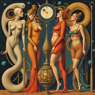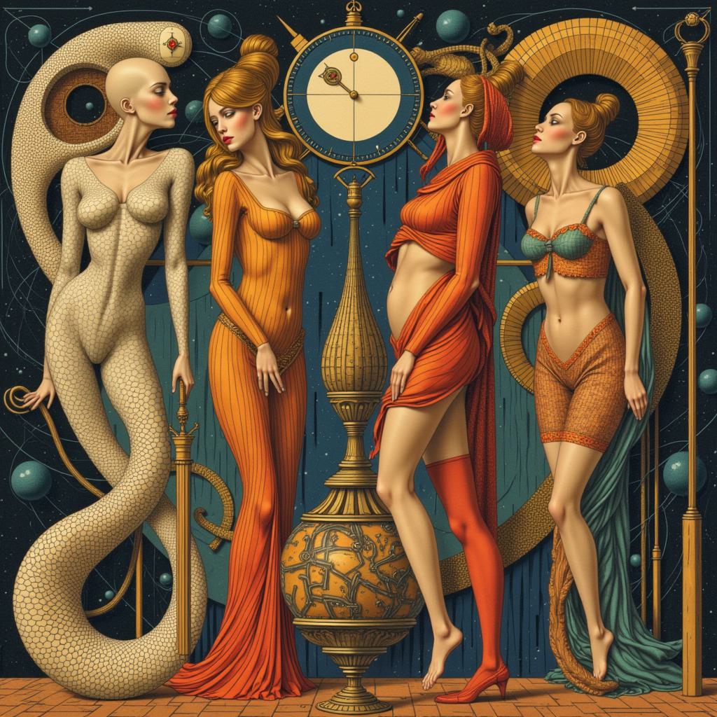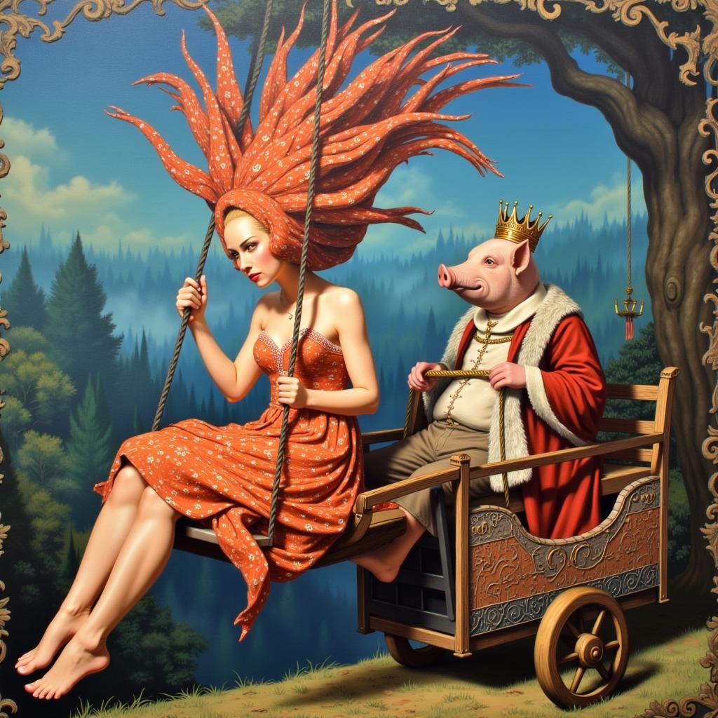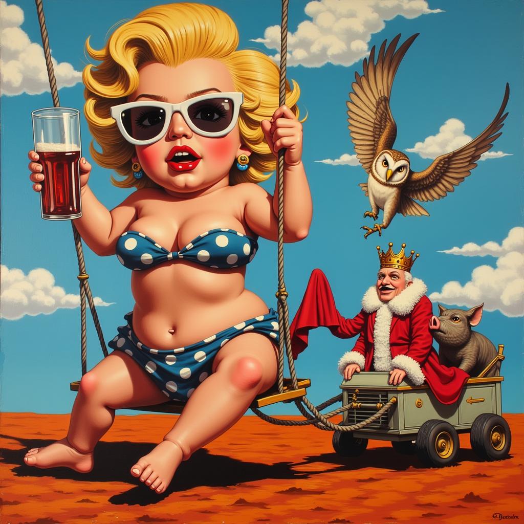 абстрактная живопись, созданная в стиле картин Jack Vettriano, которая демонстрирует МНОГО ПЕРСОНАЖНУЮ КОМПОЗИЦИЮ . МЕРЛИН МОНРО С КОЛОЙ В ТОЛСТЫХ БЕЛЫХ СОЛНЕЧНЫХ ОЧКАХ С ЭКЗОТИЧЕСКОЙ ПРИЧЕСКОЙ В ВИДЕ РЫБЫ-КЛОУНА НА КАЧЕЛЯХ И ЛЕТЯЩЕЙ СОВОЙ , СО СВИНКОЙ ЗАПРЯЖЕННОЙ В ТЕЛЕЖКУ , В КОТОРОЙ СИДИТ КОРОЛЬ С КОТОМ , переплетения БЕЛО-МРАМОРНОЙ ГИППЕРРЕАЛИСТИЧНОЙ ВЕКТОРНОЙ ГРАФИКИ , фигур и объектов намекая на борьбу с ЖЕНСКИМ подсознанием сюжета. Работы представлены в сюрреалистической перспективе, иллюстрируя ЛОШАДИНЫЙ полет, вызванный генерацией подсознательной сублимации сознания, в реконструкцию переосознания реальности в ином измерении.