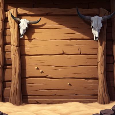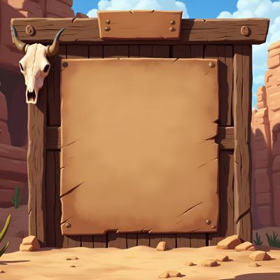 Фон игрового поля для слот-игры в стиле Дикого Запада, деревянная доска розыска в качестве основной рамки, слегка старый и потёртый вид, на одном углу висит коровий череп, с боку воткнуты две маленькие колышки, тёплая пустынная цветовая палитра, реалистичная текстура дерева, лёгкие тени, пустое пространство для барабанов, винтажная вестерн-атмосфера, детально, но не перегружено, кинематографическое освещение, высокое разрешение