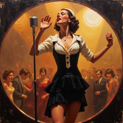 НАРИСУЙ КАРТИНУ В СТИЛЕ Jack Vettriano ТЕХНИКОЙ ШИРОКИМИ МАЗКАМИ С ТЕКСТУРНЫМ НАСЛОЕНИЕМ стиле женщин художника Jeremy Mann. ЖЕНЩИНА ДИНАМИЧНО ТАНЦУЯ ПОЕТ В МИКРОФОН ДЖАЗОВУЮ ПЕСНЮ, АРИСТОКРАТИЧНОГО ВИДА , ОДЕТАЯ ПО МОДЕ 1930 ГОДА ГОДА В ОБЛИГАЮЩУЮ ЮБКУ ЭСТРАДНЫЙ КОСТЮМ МОРЯЧКИ . НА КРУГЛОЙ СВЕТЛОЙ СТЕКЛЯННОЙ СЦЕНЕ НА ФОНЕ ДЖАЗОВОЙ РЕСТОРАННОЙ ИНСТАЛЯЦИИ РЯДОМ МУЗЫКАЛЬНАЯ ДЖАЗБАНДА