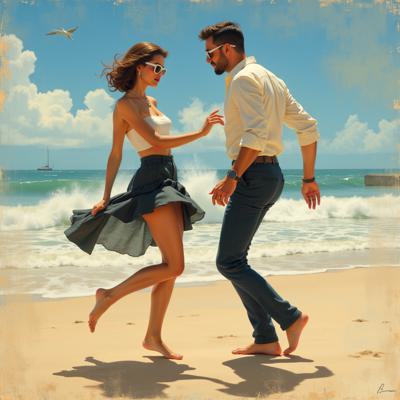 КАРТИНА В СТИЛЕ Jack Vettriano ТЕХНИКОЙ ШИРОКИМИ МАЗКАМИ С ТЕКСТУРНЫМ НАСЛОЕНИЕМ модерн, в стиле КАРТИН Jeremy Mann. ЖЕНЩИНА И МУЖЧИНА В ПРОФИЛЬ БОСИКОМ НА ПЛЯЖЕ ТАНЦУЯ ТВИСТ , АРИСТОКРАТИЧНОГО ВИДА ВНЕШНОСТИ 1950 ГОДА . ЖЕНЩИНА В ТОПЕ МИНИЮБКЕ И ТОЛСТЫХ БЕЛЫХ СОЛНЕЧГЫХ ОЧКАХ МУЖЧИНА В БОДТЯЖКАХ И БЕЛОЙ РУБАШКЕ С ПОДВЕРНУТЫМИ БРЮКАМИ РЯДОМ КОЛА И ПРИЕМНИК НА ПЕСКЕ