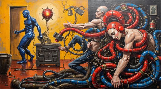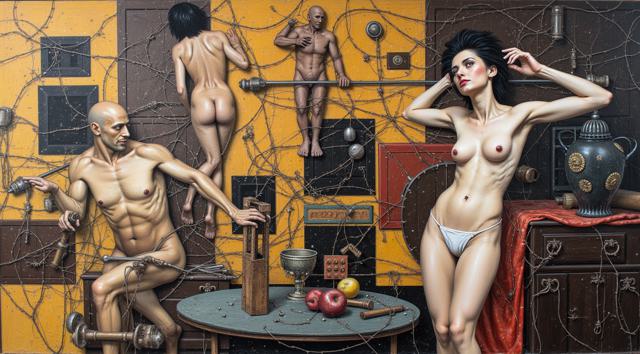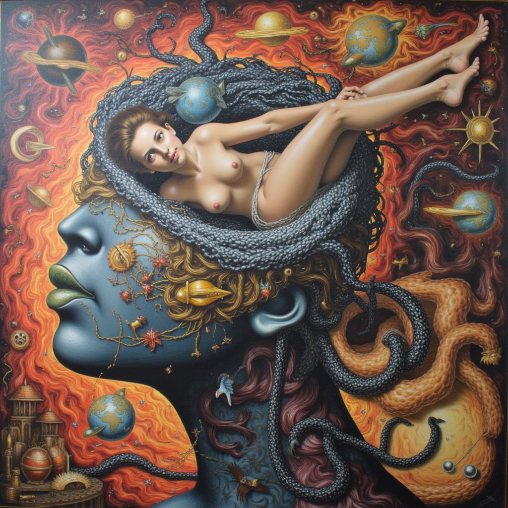 Абстрактная ЖИВОПИСЬ НАРИСОВАННАЯ В СТИЛЕ КАРТИН Diego Dayer показывающая ПЕРЕПЛЕТЕНИЕ НЕОПРЕДЕЛЕННЫХ ФИГУР И ОБЕКТОВ И намек на борьбу с подсознанием сюжета , представленный в сюрреалистической перспективы ПОЛЕТ ВЫЗВАННЫЙ ГЕНЕРАЦИЕЙ ПОДСОЗНАТЕЛЬНОЙ СУБЛЕМАЦИИ СОЗНАНИЯ В РЕКОНСТУКЦИЮ ПЕРЕОСОЗНАНИЯ РЕАЛЬНОСТИ В ИНОМ ИЗМЕРЕНИИ