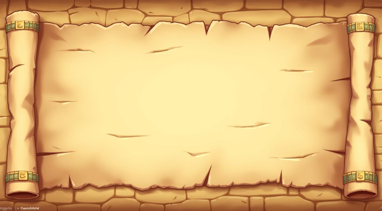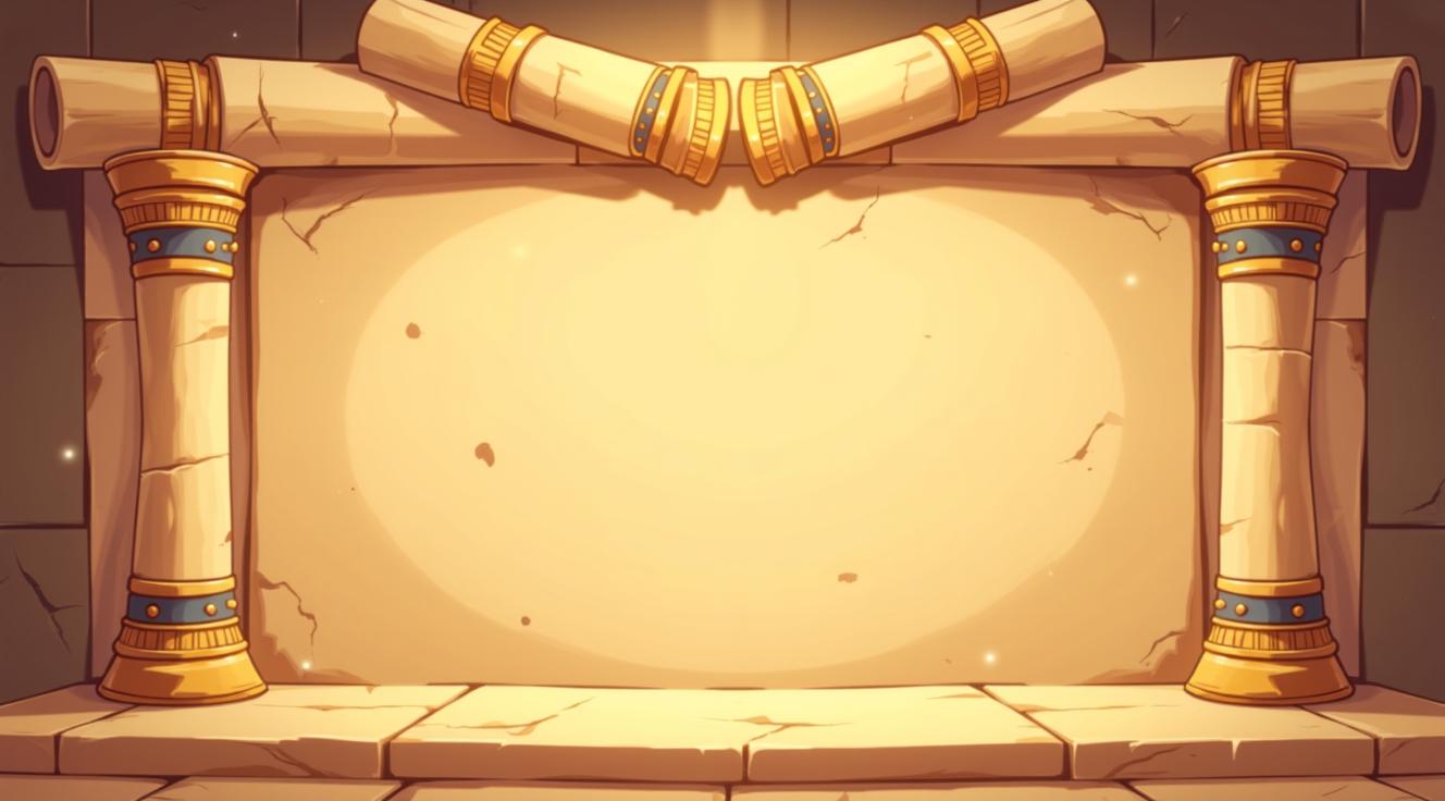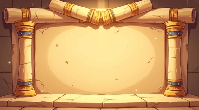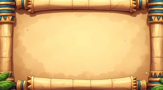 Мультяшное поле слота в виде египетского папируса, прямоугольное, слегка состаренное, с видимой текстурой волокон. Края слегка закручены, как свиток. Углы украшены миниатюрными золотыми камнями и символами скарабеев или иероглифами. Цвета теплые: бежевые и песочные оттенки с лёгким золотистым сиянием по краям. Стиль яркий, мультяшный, чистый, чтобы символы слота хорошо читались на фоне. Тонкий золотой кант или декоративный узор по краю для ощущения богатства и роскоши.