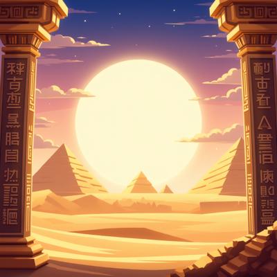 Роскошный фон в мультяшном стиле для слот-игры. В центре композиции — пустое пространство для игрового поля. Слева и справа расположены массивные колонны с древнеегипетскими письменами и орнаментами, украшенные золотыми деталями. На заднем плане видны величественные пирамиды и песчаные дюны, слегка подсвеченные солнечными лучами. Атмосфера должна передавать богатство и величие Древнего Египта, с акцентом на роскошь, золотые оттенки и декоративные детали, но при этом оставлять композицию лёгкой и гармоничной.