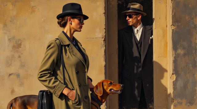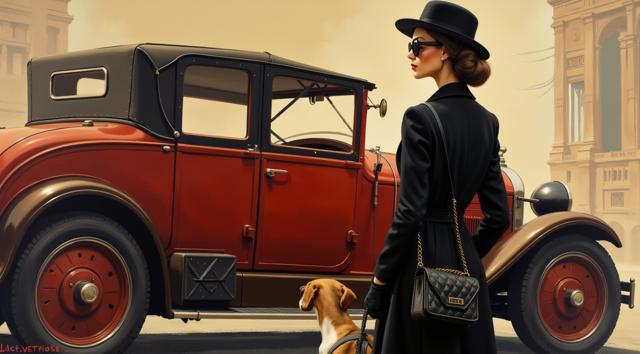 НАРИСУЙ КАРТИНУ В СТИЛЕ Jack Vettriano . ШИРОКИМИ МАЗКАМИ ТЕХНИКИ Jeremy Mann . ЖЕНЩИНА АРИСТОКРАТИЧНОГО ВИДА В ВЛАСТНОЙ ПОЗЕ , ОДЕТАЯ в пальто и ШЛЯПКУ КОТЕЛОК ПО МОДЕ 1950 ГОДА, ПОКАЗАННАЯ ДО ПОЯСА В ТОЛСТЫХ СОЛНЕЧНЫХ ОЧКАХ и сумочкой через плече с биглем на поводке В ПРОФИЛЬ НА ФОНЕ автомобиля 1920, ВИТИЕВАТОЙ ограды и гигантсКОГО морскОГО СУДНА НА ПРИСТАНИ Нью-Йорка В БЕЛЫЙ, СВЕТЛО ТЕРРАКОТОВЫЙ, Графитовый, Светло-серый, Белый — ПАЛИТРАМИ