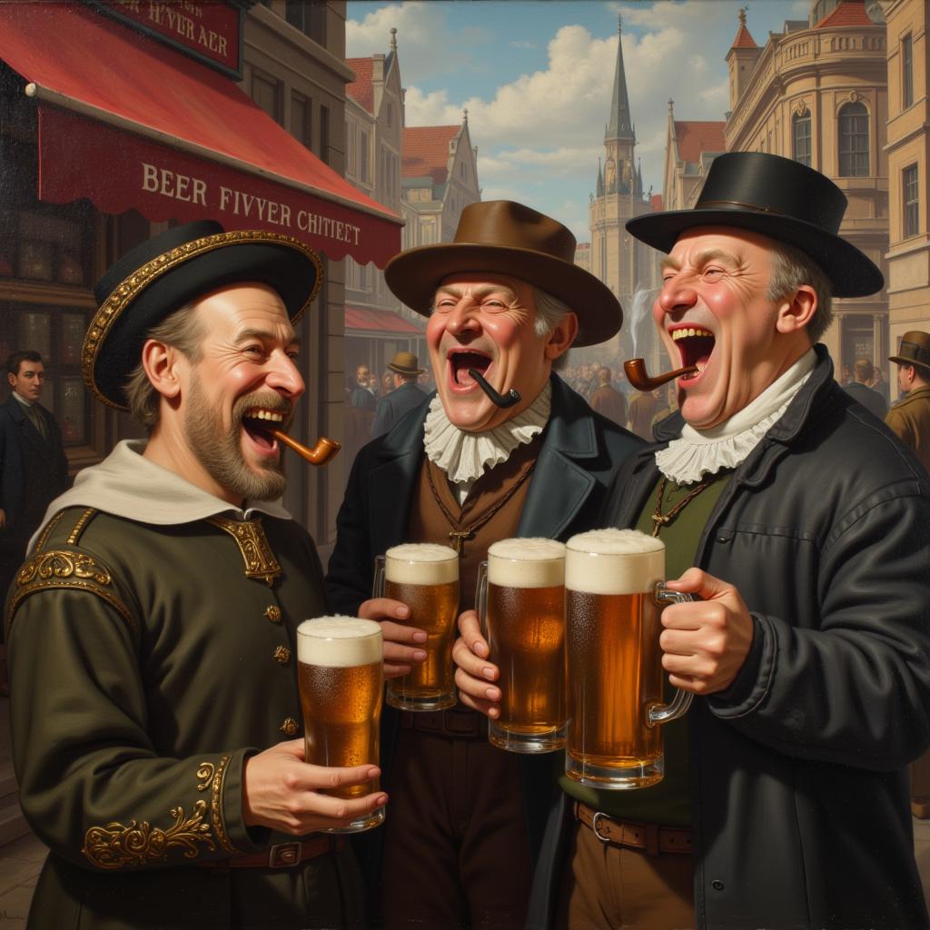 СРЕДНЕВЕКОВАЯ КЛАССИЧЕСКАЯ ЖИВОПИСЬ. ДВОЕ РАЗНЫХ С ВИДУ СМЕЮЩИХСЯ МУЖЧИН В ПРОФИЛЬ ОПУХШЕГО САТИРИЧЕСКОГО ВИДА С БОЛЬШИМИ ГОЛОВАМИ ОДЕТЫЕ В КОСТЮМ БОЦМАНА С КУРИТЕЛЬНОЙ ТРУБКОЙ ВО РТУ И ПРОСТОЛЮДИНА ВРЕМЕН ВИКТОРИАНСКОЙ ЭПОХОХИ СТОЯТ ДЕРЖА БОЛЬШИЕ КРУЖКИ С ПИВОМ НА УЛИЦЕ ПОД НАВЕСОМ ПИВНОГО ТРАКТИРА РЯДОМ У НОГ ДВОРНЯЖКА