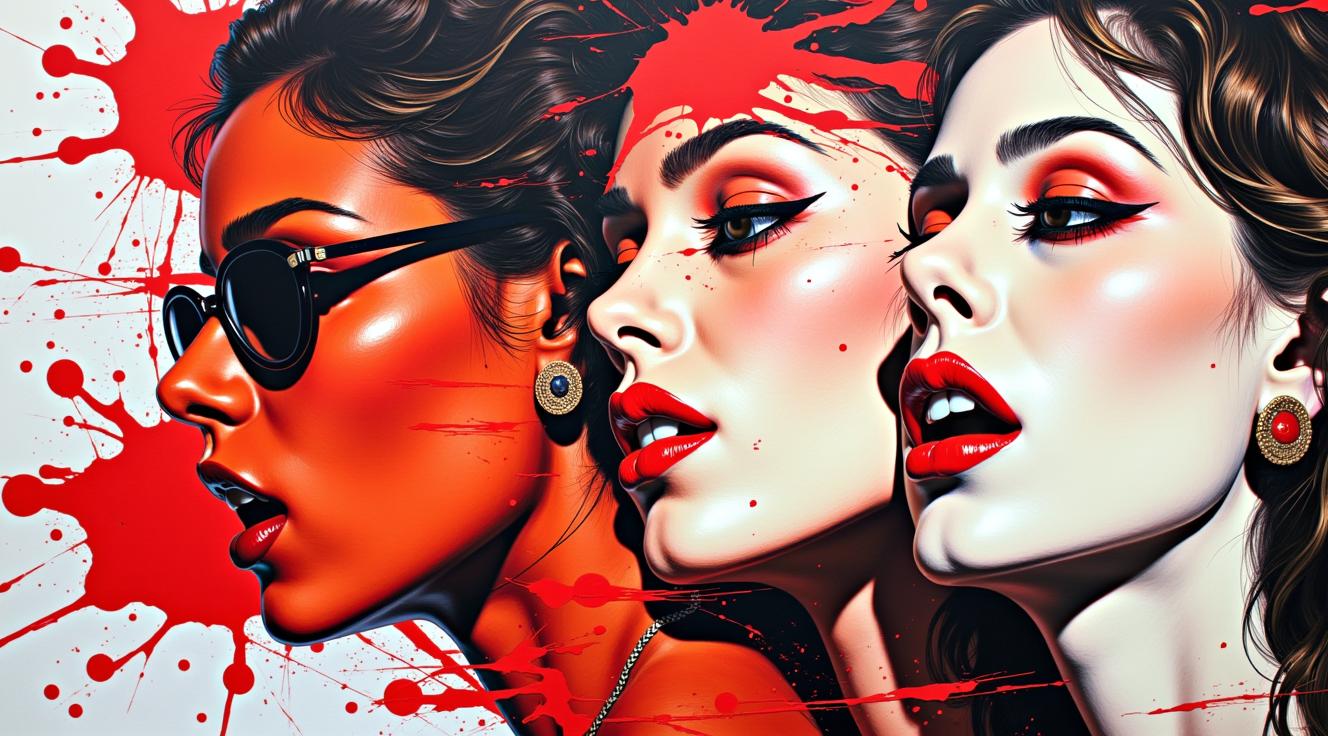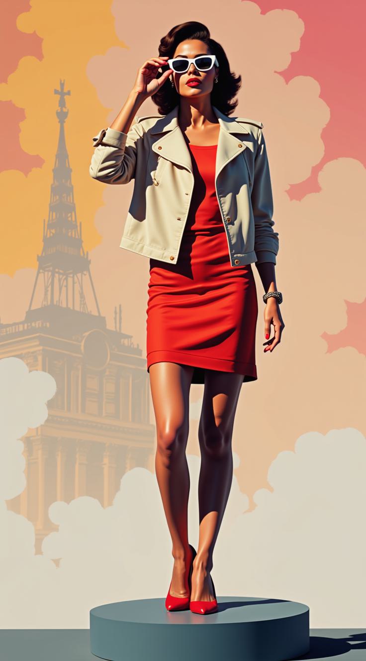 ПОП АРТ живопись, созданная в стиле картин Jack Vettriano, которая демонстрирует МНОГО ПЕРСОНАЖНУЮ КОМПОЗИЦИЮ. Уверенная стильная ЖЕНЩИНА В ТОЛСТЫХ БЕЛЫХ СОЛНЕЧНЫХ ОЧКАХ, ОДЕТОЙ ПО МОДЕ 1950 ГОДА , СЛЕГКА ПРИОТКРЫЛА РОТ ПРИДЕРЖИВАЯ ПАЛЬЦАМИ ОЧКИ С ПРАВА И ЛЕВА СТОИТ НА ПОДИУМЕ НА СЕРО-БЕЛОМ ВЕКТОРНОМ СТИЛИЗОВАННОМ ФОНЕ ВИТРИНЫ МОДНЫХ САЛОНОВ И ЛЮДЕЙ В ПРОФИЛЬ , интеллектуальный элегантный образ, сильный зрительный контакт, современный редакционный стиль Dior Zara, минималистичный студийный фон, драматическое освещение, фотосессия для роскошных журналов, изысканная атмосфера, высокая мода, мощная женская энергия