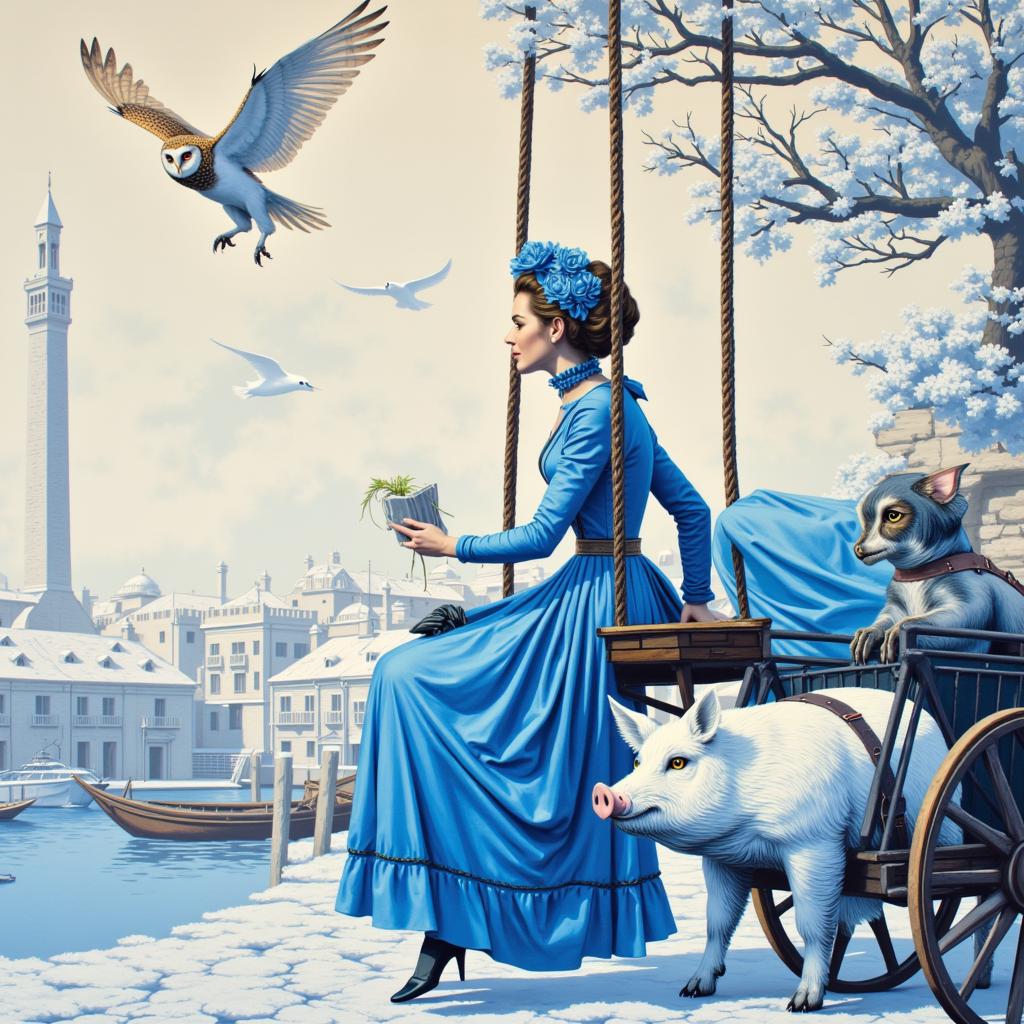 абстрактная живопись, которая демонстрирует в стиле Jack Vettriano, МНОГО ПЕРСОНАЖНОЙ КОМПОЗИЦИИ В ВИДЕ переплетения БЕЛО-МРАМОРНОЙ ГИППЕР РЕАЛИСТИЧНОЙ ВЕКТОРНОЙ ГРАФИКИ , фигур и объектов. ЖЕНЩИНА В ВИКТОРИАНСКОМ голубом ПЛАТЬЕ НА КАЧЕЛЯХ С ЛЕТЯЩЕЙ СОВОЙ , СО СВИНЬЕЙ ЗАПРЯЖЕННОЙ В ТЕЛЕЖКУ , В КОТОРОЙ СИДИТ КОРОЛЬ С КОТОМ, Намекая на борьбу с ЖЕНСКИМ подсознанием сюжета, картина представлена в сюрреалистической перспективе, иллюстрируя ЛОШАДИНЫЙ полет, вызванный генерацией подсознательной сублимации сознания, в реконструкцию переосознания реальности в ином измерении.