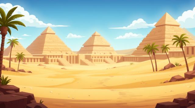 Фон в стиле мультяшного слота, египетская тематика. На заднем плане величественные пирамиды, песчаные барханы и несколько стройных пальм. Композиция построена так, чтобы центральная часть оставалась пустой для игровых элементов, а основные детали и украшения были сосредоточены по бокам слева и справа. Атмосфера роскоши и богатства: золотистые оттенки песка, сияние солнца, декоративные узоры и акценты, подчеркивающие величие и богатство Древнего Египта.