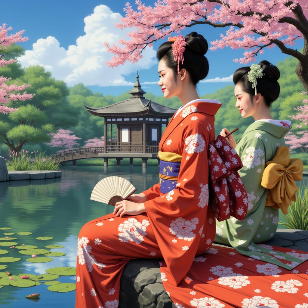 НАРИСУЙ КАРТИНУ В СТИЛЕ Jack Vettriano в стиле КАРТИН Jeremy Mann В СОЛНЕЧНЫЙ ДЕНЬ ДВЕ ЯПОНСКИЕ УЛЫБАЮЩИЕСЯ ГЕЙШИ В ПРОФИЛЬ В РАЗНОЙ РАСЦВЕТКИ НАРЯДАХ СИДЯТ ВОЗЛЕ ПРУДА . ЗА ГЕЙШАМИ БЕСЕДКА АДЗУМАЯ. ОДНА ДЕВУШКА СИДИТ НА КАМНЕ , ВТОРАЯ СТОИТ РЯДОМ С ВЕЕРОМ В РУКЕ . В ВОДЕ ПРУДА ОСОКА И КУВШИНКИ . ВОКРУГ ДЕРЕВЬЯ И КУСТЫ