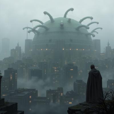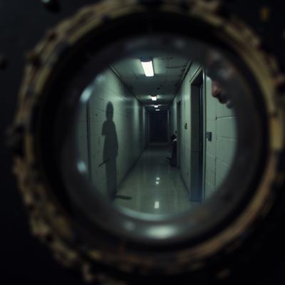 A man's eye pressed against a dirty door peephole, view of an empty, dimly lit hallway, a shadow in the corner seems to move, cinematic, style of "Se7en", heavy film grain, anamorphic lens distortion, colors are muted and toxic, high contrast, extreme close up, sense of voyeurism and paranoia --ar 1:1 --no monster, clear figure