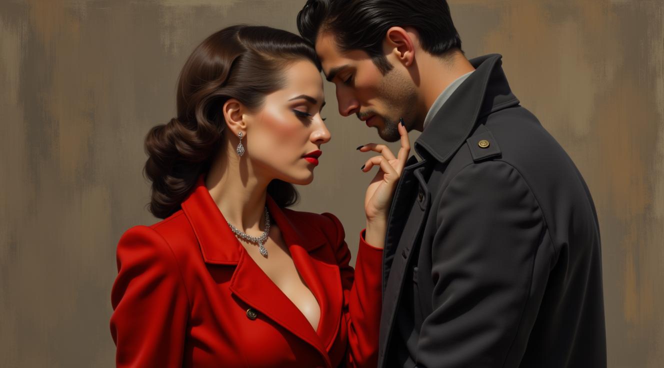 НАРИСУЙ КАРТИНУ В СТИЛЕ Jack Vettriano И в стиле ТЕХНИКОЙ ШИРОКИМИ МАЗКАМИ КАРТИН Jeremy Mann. ЖЕНЩИНА В ПРОФИЛЬ АРИСТОКРАТИЧНОГО ВИДА ОДЕТАЯ ПО МОДЕ 1950 ГОДА В КРАСНЫЙ КОСТЮМ С МИНИ ПОВИСЛА НА ШЕЕ МУЖЧИНЫ В ПРОФИЛЬ В РАССТЕГНУТОМ ТЕМНО СЕРОМ ПАЛЬТО 1950 ГОДА В ПРОФИЛЬ, ОБНИМАЮЩИЙ ОДНОЙ РУКОЙ ЖЕНЩИНУ , ВО ВТОРОЙ РУКЕ БУКЕТ РОЗ