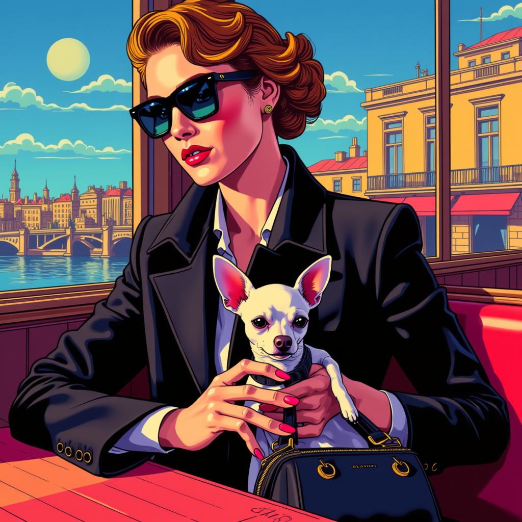 Интуитивная живопись в стиле ПОП АРТ ВЕКТОРНОЙ ГРАФИКИ В СТИЛЕ Jack Vettriano ЖЕНЩИНА КРУПНЫМ ПЛАНОМ АРИСТОКРАТИЧНОЙ ВНЕШНОСТИ 1950 ГОДА В ТОЛСТЫХ КИБЕРПАНКОВСКИХ СОЛНЕЧНЫХ ОЧКАХ И ПИДЖАКЕ КЕЛЬВИН КЛЕЙН , ДЕРЖИТ В ОДНОЙ РУКЕ СУМОЧКУ Hermès, В ДРУГОЙ ЧИХУАХУА , СИДЯ В РЕСТОРАНЕ НА ФОНЕ ОКНА С ВИДОМ НА УЛИЦУ. СЕРАЯ, КРЕМОВАЯ , СВЕТЛО-ТЕРРАКОТОВАЯ, ОХРОВАЯ, ОЛИВКОВАЯ ПАЛИТРЫ