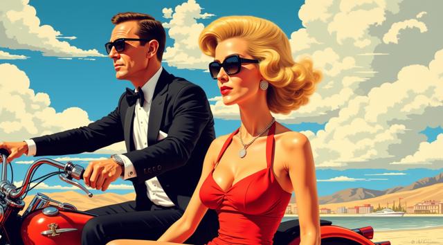 ПОП АРТ живопись, созданная в стиле картин Jack Vettriano, которая демонстрирует МНОГО ПЕРСОНАЖНУЮ КОМПОЗИЦИЮ . ДЖЕЙМС БОНД НА МОТОЦИКЛЕ В ПРОФИЛЬ В ТОЛСТЫХ СОЛНЕЧНЫХ ОЧКАХ , РЯДОМ БЛОНДИНКА ОДЕТАЯ ПО МОДЕ 1950 ГОДА переплетения БЕЛО-МРАМОРНОЙ ГИППЕРРЕАЛИСТИЧНОЙ ВЕКТОРНОЙ ГРАФИКИ , фигур и объектов намекая на борьбу с ЖЕНСКИМ подсознанием сюжета. Работы представлены в сюрреалистической перспективе, иллюстрируя ЛОШАДИНЫЙ полет, вызванный генерацией подсознательной сублимации сознания, в реконструкцию переосознания реальности в ином измерении.,