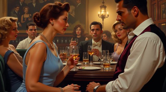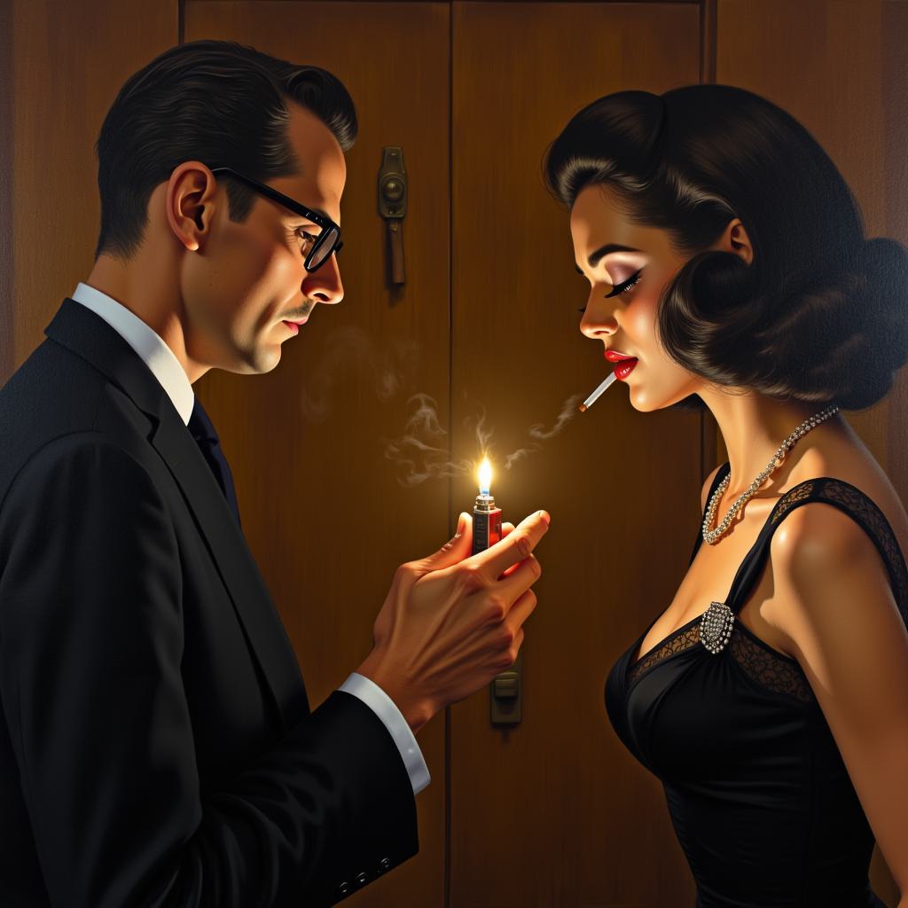 НАРИСУЙ КАРТИНУ В СТИЛЕ Jack Vettriano И в стиле КАРТИН Jeremy Mann. МУЖЧИНА В ПРОФИЛЬ АРИСТОКРАТИЧНОГО БЮРОКРАТИЧНОГО ВИДА В ОЧКАХ ПРОТЯГИВАЕТ ЗАЖИГАЛКУ ЖЕНЩИНЕ В ПРОФИЛЬ ПРИКУРИТЬ. ЖЕНЩИНА И МУЖЧИНА ОДЕТЫ ПО МОДЕ 1950 ГОДА. МУЖЧИНА В ЧЕРНЫЙ КОСТЮМ ГАЛСТУК , ЖЕНЩИНА В ЧЕРНОЕ ПЛАТЬЕ БЕЗ РУКАВОВ , УКРАШЕННЫЕ МАЛЕНЬКИМИ РОЗОЧКАМИ С ЗЕЛЕНЬЮ . НА ФОНЕ АБСТРАКТНОЙ БОЛЬШОЙ КАРТИНЫ С ЯХТОЙ