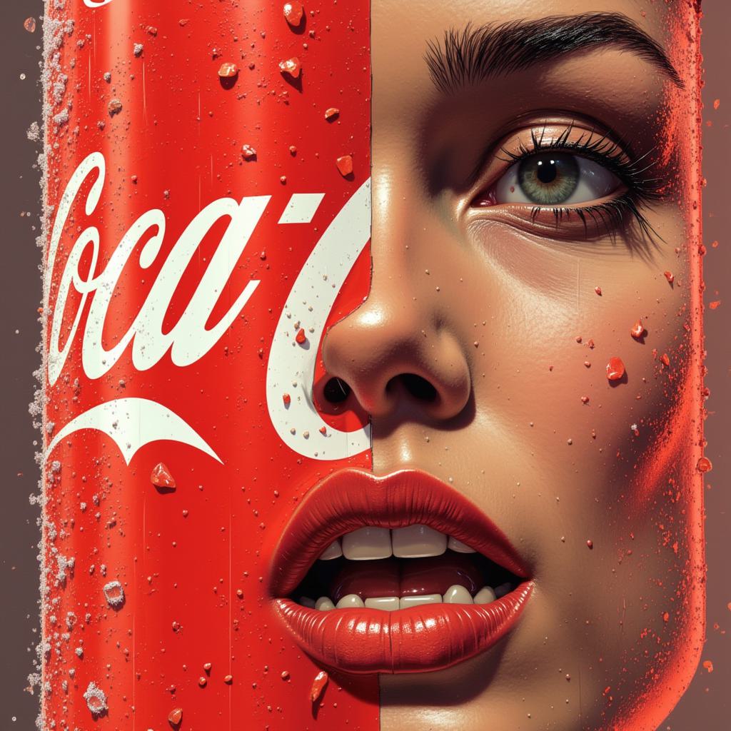 Интуитивная живопись в стиле ПОП АРТ ВЕКТОРНОЙ ГРАФИКИ В СТИЛЕ Jack Vettriano ГИГАНТСКАЯ БАНКА КОКА-КОЛЫ КРУПНЫМ ПЛАНОМ СНИЗУ НЕМНОГО ПОКРЫТА ИНЕЕМ И КОНДЕНСАТОМ ПЕРЕКРЫВАЮЩАЯ ПОЛОВИНУ ОЧЕНЬ ПОТНОГО АРИСТОКРАТИЧНОГО ЖЕНСКОГО ЛИЦА ИЗМОЖДЕННОГО ОТ ЖАЖДЫ С СУХИМ РТОМ В СВЕТЛО ТЕРРАКОТОВЫЙ, Графитовый, Светло-серый, ПАЛИТРАМИ