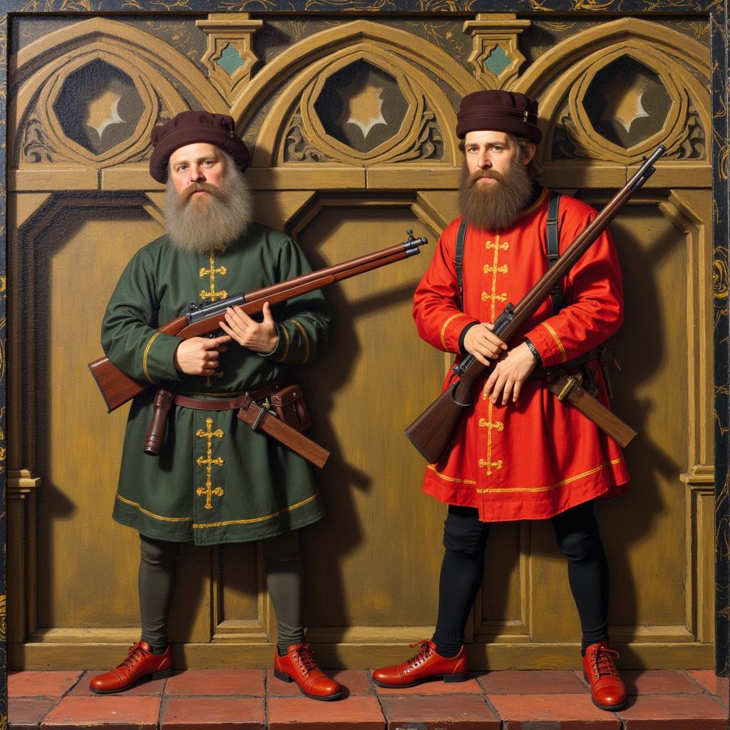 СРЕДНЕВЕКОВАЯ КЛАССИЧЕСКАЯ ЖИВОПИСЬ В ЮМОРИСТИЧНОМ ЖАНРЕ . НА ФОНЕ АБСТРАКТНОМ ГЕОМЕТРИЧЕСКОМ С ГОТИЧЕСКИМ ОРНАМЕНТОМ ДВА ОХОТНИКА ОДИН НИЗКОГО РОСТА ТОЛСТЫЙ ВТОРОЙ ХУДОЙ ВЫСОКОГО РОСТА В СРЕДНЕВЕКОВЫХ ОХОТНИЧЬИХ ПРИДВОРНЫХ МУНДИРАХ С СРЕДНЕВЕКОВЫМИ ОХОТНИЧЬИМИ РУЖЬЯМИ НА ИЗГОТОВКЕ НАПРЯЖЕННО ИДУТ КРАДУЧИСЬ ОХОТЯСЬ РЯДОМ ДВЕ ОХОТНИЧЬИХ ТАКСЫ