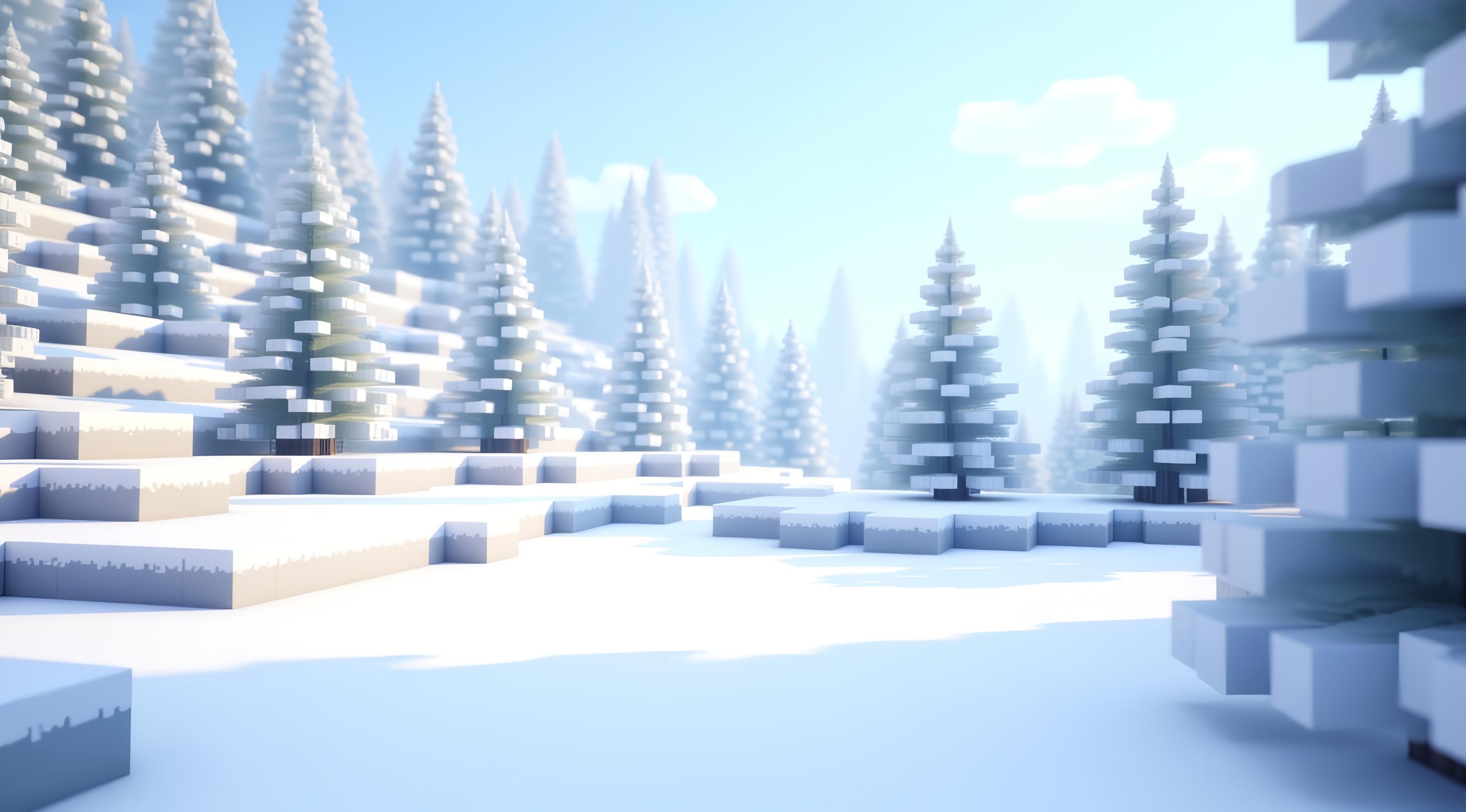 A stylized snowy landscape in a clear Minecraft-like voxel aesthetic. Blocky snow-covered ground made of square voxel tiles. Pine trees made of stacked cubic layers of snowy leaves, arranged in rows leading into the distance. Soft depth of field, but still clearly showing the blocky geometry. Light pastel sunrise sky with gentle warm light, subtle shadows falling across the voxel snow. No characters, no items — only a peaceful Minecraft-style winter biome with simple shapes and clean cubes. High resolution 1920×1080, vibrant, crisp, voxel art.