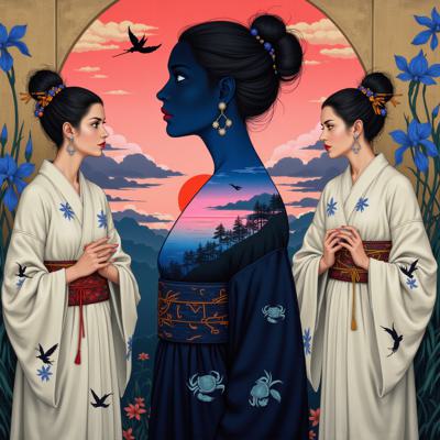 КЛАССИЧЕСКАЯ СРЕДНЕВЕКОВАЯ ЖИВОПИСЬ . ПО ЦЕНТРУ АДСТРАКТНЫЙ ЖЕНСКИЙ СИЛУЭТ В КОТОРОМ ЗАПЕЧАТЛЕН ТЕМНО СИНИЙ ПЕЙЗАЖ С РОЗОВЫМ ЗАКАТОМ И СИНИМИ ИРИСАМИ ПО ПРАВУЮ И ЛЕВУЮ СТОРОНУ ПО ТРИ ЖЕНЩИНЫ ОДЕТЫЕ В В БЕЛЫЕ КИМОНО С ОРНАМЕНТАМИ ЛАСТОЧЕК И КРАБОВ . НА БЛИЖНЕМ ПЛАНЕ СИНИЕ ИРИСЫ . ФОН АБСТРАКТНАЯ ЗОЛОТИСТАЯ ДРАПИРОВКА С ГОТИЧЕСКИМ ОРНАМЕНТОМ И ЛАСТОЧКИ ЛЕТАЮЩИЕ ПОВЕРХ ФОНА
